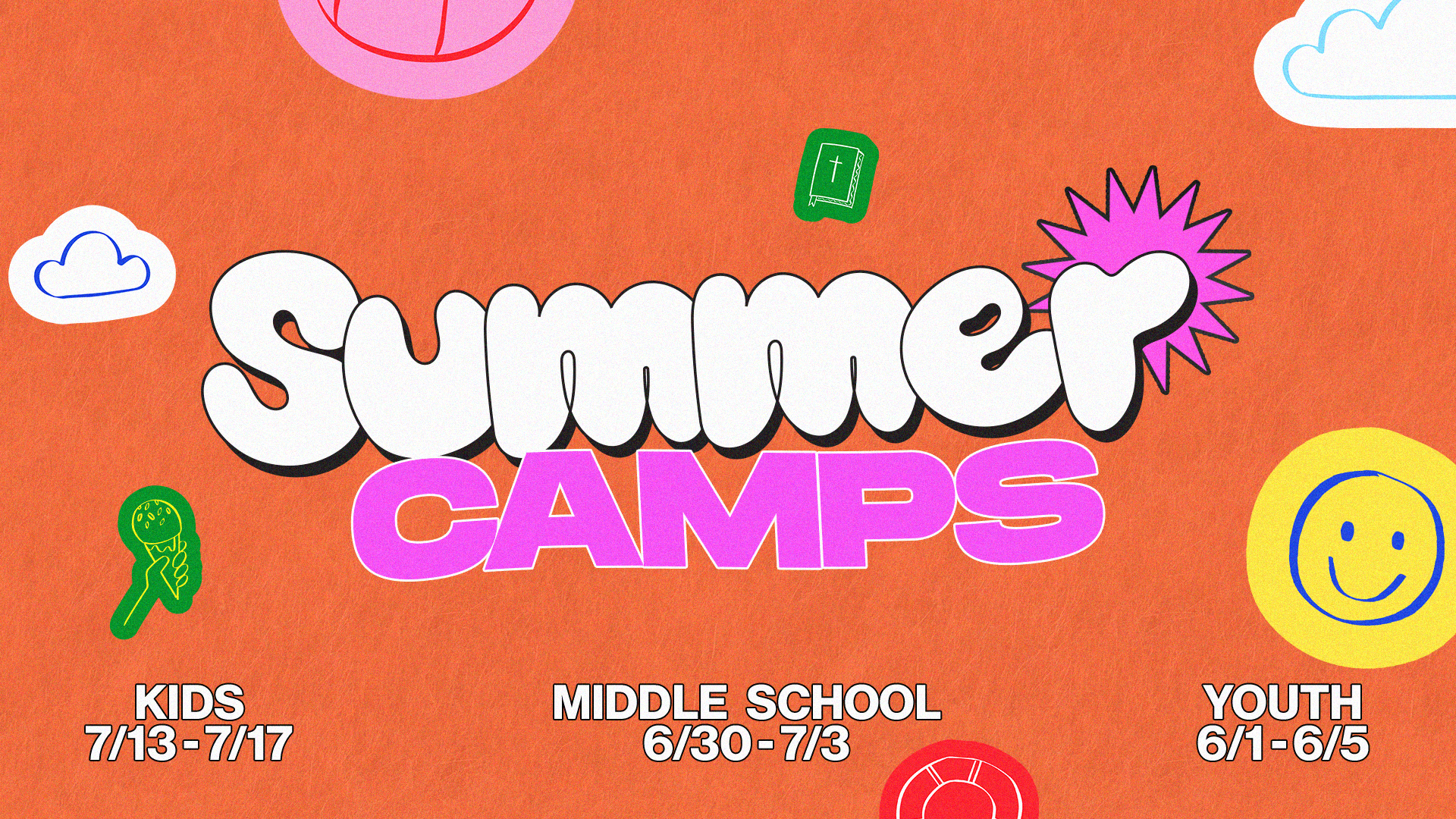 We are so excited for Kids Camp, happening Monday, July 13 through Friday, July 17! Kids Camp is a fun, safe, and engaging experience designed to help kids grow in their faith, build friendships, and make lasting memories. Through worship, Bible lessons, games, and activities, kids will learn more about who God is and how much He loves them. This camp is for students who have completed 2nd grade. The cost is $225 per camper.